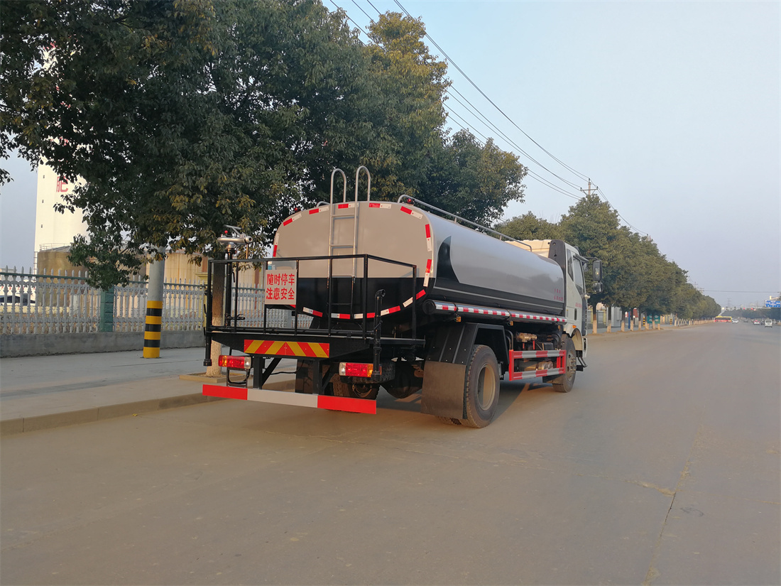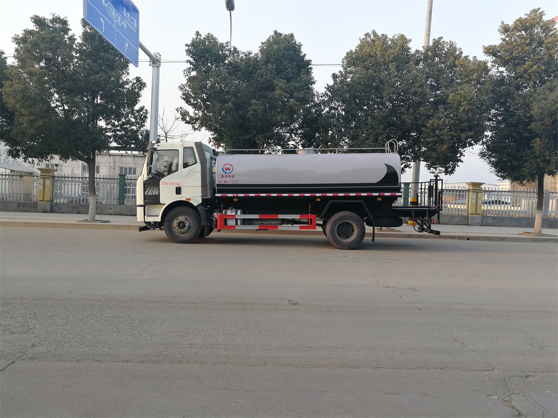 灑水車前裝有鴨形噴嘴或圓頭沖嘴,后面裝有圓柱開灑水噴嘴或蓮蓬頭噴嘴,后部有一工作平臺(tái),裝配有水炮。后部還可裝8個(gè)噴嘴(選裝)。