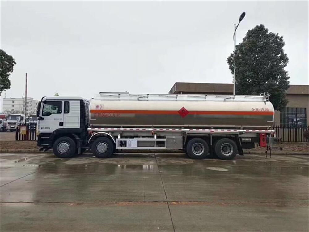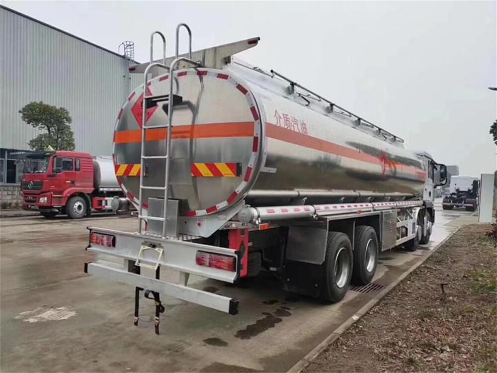 2.上裝配置:上裝采用國標5083鋁合金板材,公告容積30.4(實際有效容積約32立方),標配單倉,帶泵進泵出,標配兩個歐標罐蓋和緊急切斷閥,帶歐標全套下裝油系統(tǒng)(含下裝卸油閥、防溢流裝置和油氣回收裝置等),罐體頂部兩側(cè)帶折疊式升降防護欄,隨車配送兩根卸料軟管、陰陽端接頭、下裝油口轉(zhuǎn)換接頭等,其余均為廠家標配。罐體油漆為銀粉色金屬漆,兩側(cè)及后封頭水平正中貼3M-1級橙色反光帶,反光板,貼“易燃液體”標識,貼安全告示牌。