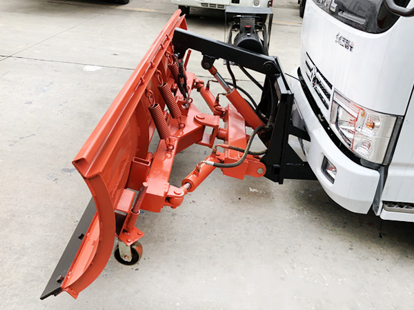 除雪鏟安裝時,將除雪鏟與汽車對正,操縱汽車前端的快速連接架與雪鏟連接架對準,把雪鏟的液壓單元與汽車車載24v電源接通,將雪鏟的連接架與汽車的快速連接架連接,并用銷子將雪鏟與快速連接架固定。雪鏟安裝后,調整雪鏟左右偏轉油缸,使雪鏟鏟面與車輛前進方向形成一定的夾角,以利于除雪時將雪拋向路邊。